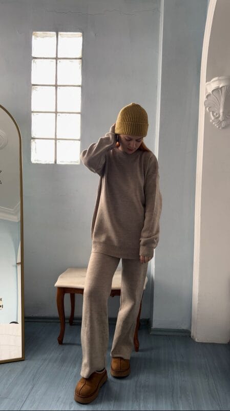 Bisiklet Yaka Oversize Bej Pamuklu Triko Takım